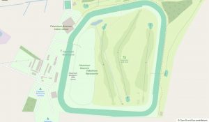 The red dashed line crossing the left hand side of the racetrack itself is our access to the field. The building above that is The Gallow. Between the two is the car park.
